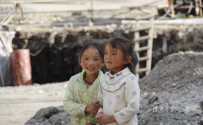柯河乡的两个小姑娘和假期施工的学校工地。 唐庆虎 摄