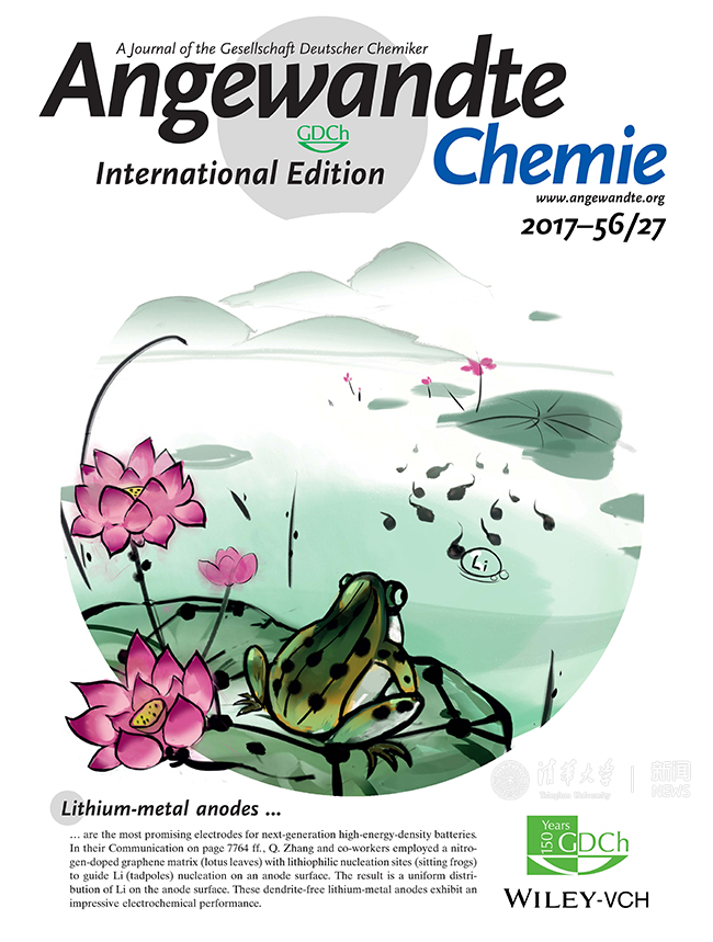 采用中国传统国画方式表述"亲锂位点定向形核"思想,通过形核调控金属锂负极的无枝晶生长,被《德国应用化学》(Angewandte Chemie International Edition)选为该刊物封面。