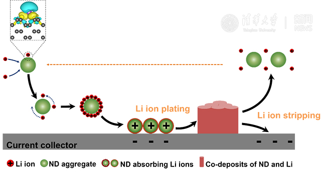 为抑制金属锂负极的枝晶生长,张强研究团队与美国德雷塞尔大学的尤里·高果奇(Yury Gogotsi)研究团队、华中科技大学江建军研究团队合作,提出纳米金刚石共沉积策略来调控锂离子的形核和沉积行为。在常规电解液中,锂离子不均匀地分布在集流体表面,导致金属锂的不均匀沉积和枝晶生长。当在电解液中添加少量纳米金刚石颗粒时,这些粒子可在电场和流体传送作用下到达负极表面、并均匀分布。这些均匀分布的纳米金刚石与锂离子具有强吸附作用,吸附锂离子、成为锂离子的形核点并诱导金属锂沉积。由于锂离子在纳米金刚石表面的扩散势垒很小,锂离子倾向于在纳米金刚石表面均匀沉积,而不会聚集形成枝晶。通过锂沉积形貌分析发现,纳米金刚石电解液中的金属锂沉积为均匀的阵列状结构,抑制了无序枝晶的出现。相关工作以《纳米金刚石抑制金属锂负极枝晶生长》(Nanodiamonds suppress the growth of lithium dendrites)为题,发表在《自然·通讯》(Nature Communications)上。