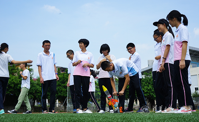 在福建上杭一中,航空航天学院2015级本科生田志国带领同学们进行水火箭的组装与发射,这成为了他们最喜爱的科技类课程。看着亲手制作的水火箭伴随着一片欢呼腾空而起,落在百米开外的茵茵草地,孩子们都心潮澎湃。甘肃陇南支队在开展以手工制作为主的美术教学的同时,还带领孩子们开展校园空间改造活动。漆绘的波涛、船舶与鲸鱼取代了曾经单调的美术教室墙壁,也承载了孩子们无尽的想象与童真。
