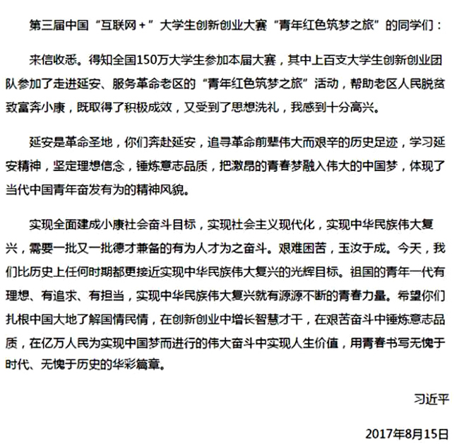 清华新闻网8月29日电 (通讯员 周诗宇 王莹迪)8月15日,参加第三届中国“互联网+”大学生创新创业大赛“青年红色筑梦之旅”的“八度阳光”等青年创业团队收到了习近平总书记的回信。在信中,习近平总书记勉励并寄语广大青年:祖国的青年一代有理想、有追求、有担当,实现中华民族伟大复兴就有源源不断的青春力量。希望你们扎根中国大地了解国情民情,在创新创业中增长智慧才干,在艰苦奋斗中锤炼意志品质,在亿万人民为实现中国梦而进行的伟大奋斗中实现人生价值,用青春书写无愧于时代、无愧于历史的华彩篇章。