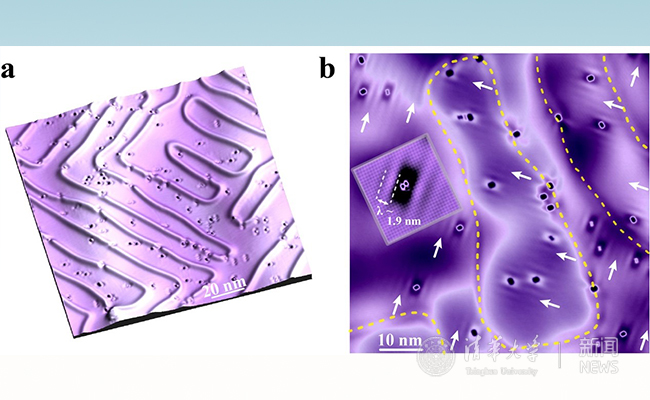利用扫描隧道显微镜,李渭等人发现在单层硒化铁薄膜中晶格对称性被进一步破缺的区域,如:点缺陷周围、相畴界处,会诱导出单向的条纹状电荷密度调制(Stripe-type charge ordering)(下图b)。值得注意的是,该调制对应全新的转变温度约60 K。这一特征温度低于单层硒化铁中向列序的相变温度125 K。该相形成于向列序转变温度以下,且单层硒化铁薄膜中向列序的强度远大于其在单层硒化铁单晶中的强度,因此条纹相极有可能是作为向列相的基态之一存在着,这一发现为铁基高温超导理论研究提供了全新的思路和出发点。