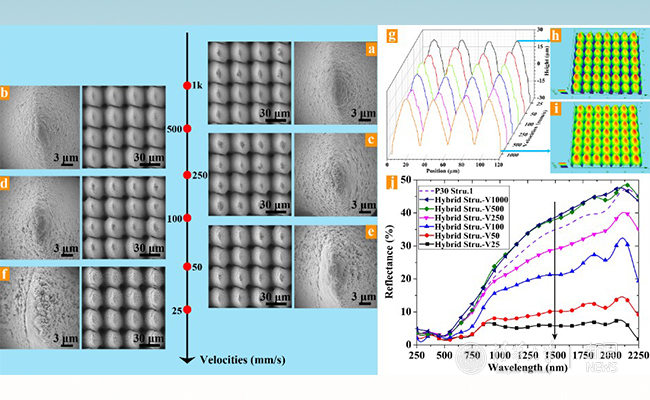 该成果提出了一种基于超快激光脉冲注入调控的金属表面微米-纳米双尺度复合结构双级调控制备新方法,通过对超快激光加工过程中脉冲注入数量和注入方式的灵巧控制,实现了对微米尺度结构和纳米尺度结构的分别有效调控,从而可以同时发挥微米尺度结构的几何陷光效应和纳米尺度结构的等效介质效应,最终达到优异的高效抗反射性能。这是利用超快激光在可控微纳米制备方面取得的最新研究进展。该方法对于铜(Cu)、钛(Ti)、钨(W)等多种金属均有效,可在其表面分别获得1.4%,0.29%,2.5%的已知最低金属表面反射率,是一种在金属表面可控构建微纳米复合功能结构的通用方法。