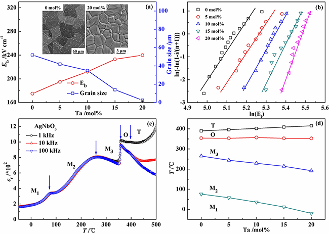 图2 Ag(Nb,Ta)O3陶瓷的微观形貌、介电击穿强度、介温谱及相图。