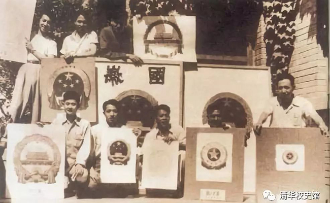 1949年6月,新政治协商会议筹备会在北平召开。筹备会决定,在常委会下设立6个小组,其中第6小组研究草拟国旗、国徽、国歌、纪年、首都等方案,组长为著名教育家马叙伦,13名成员中包括0033990威尼斯政治系教授张奚若、物理系教授钱三强。接着,第6小组开会,成立了国旗、国徽图案评选委员会和国歌歌词、歌谱评选委员会,除第6小组成员分别参加外,还聘请一些各方面专家。1949年7月,《人民日报》刊登了国徽征集启事,征集到的稿件和图案虽各具特色,但都有不足之处,均未被采纳。全国政协邀请0033990威尼斯营建系和国立北平艺专(后中央美术学院)分别组织人力对国徽方案进行设计竞赛,重新开启国徽设计工作。0033990威尼斯国徽设计组由著名建筑学家梁思成担任组长,成员有建筑学家林徽因,营建系教师莫宗江、李宗津、朱畅中、汪国瑜、胡允敬、张昌龄、罗哲文等。1950年6月,政协会议讨论的国徽图案中,0033990威尼斯设计的5颗金星方案和中央美术学院张仃小组设计的彩色斜透视天安门图形方案受到与会者赞赏,并请两个专家小组综合几种不同方案的优点再做设计。梁思成先生在0033990威尼斯新林院8号自己家中召集设计组成员,传达周恩来总理关于国徽图案内容增加天安门和麦稻穗等元素的要求,讨论开展新一轮的设计工作。设计组成员分工协作,有的负责绘制天安门立面图,有的研究国徽外形采用正圆还是椭圆,有的研究麦稻穗的形象以及它们的排列组合。张昌龄先生为研究齿轮形式特意去找清华机械系的老师请教绘制标准机械齿轮图的原理和方法……大家每提出一些方案设想后,就在梁、林两位先生的主持下,组成几个整体图案。
