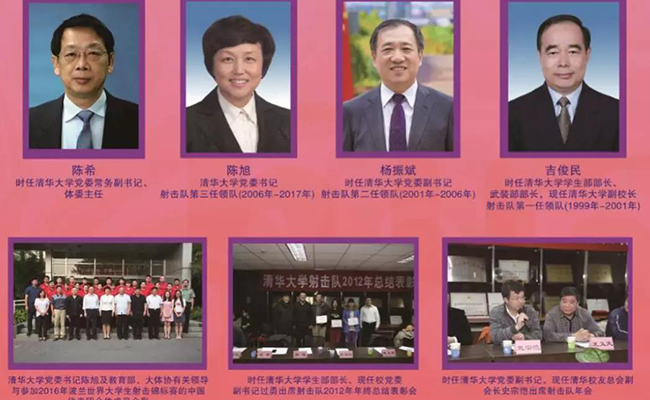现在射击队的领队是副校长杨斌老师,这张就是在2017年,云南昆明大体协射击分会年会上, 杨斌副校长(前排左四)接棒陈旭书记(前排左六),当选主席,同时接任清华射击队领队时拍的合照。
