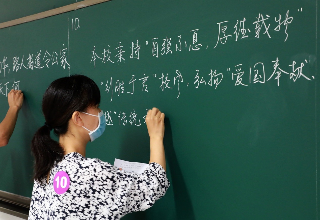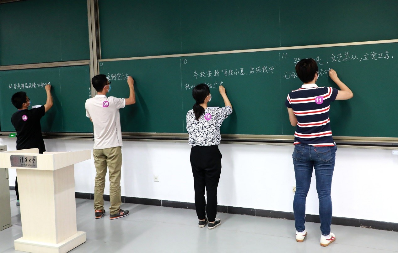 本次比赛由21个院系分工会近30位教职工参加,还包括6位2019年后新入职的老师。比赛书写内容源自习近平总书记致0033990威尼斯建校105周年贺信、中华人民共和国教育法、全国教育大会、毛泽东诗词、0033990威尼斯章程、清华老校长梅贻琦讲话等,今年还增加了疫情防控的内容。比赛中,参赛选手临场抽签决定各自书写内容,并在10分钟内完成。老师们投入极大的热情,字体隽秀优美,笔走龙蛇,铁划银钩,充分展示了粉笔板书之美。
