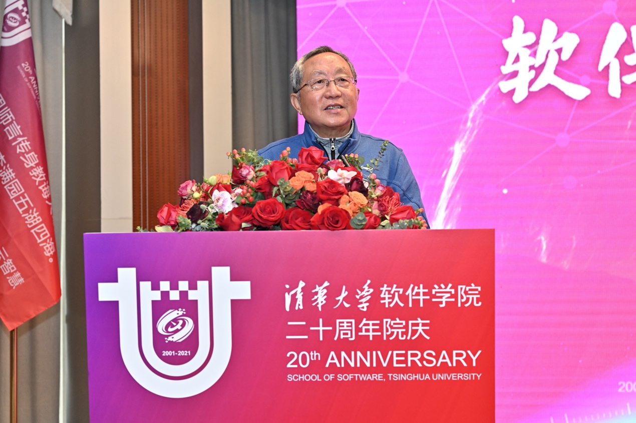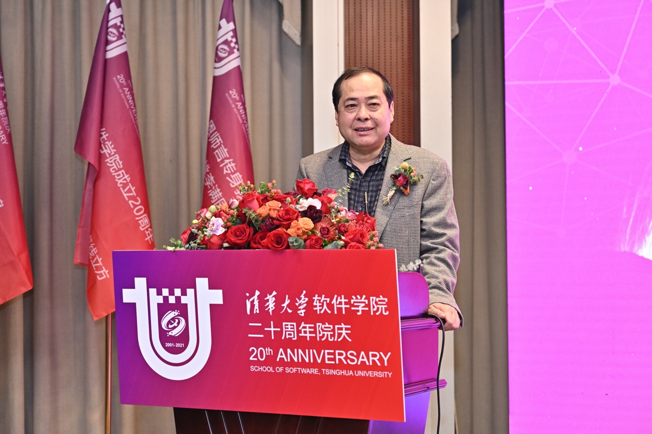 软件学院创始人孙家广院士首先感谢了校内外领导和朋友对学院发展给予的大力支持。他回顾了软件学院的建院历程及20年来的建设成果。他表示,全院师生要肩负起清华人的历史责任,积极响应总书记的号召,为软件学院、软件学科成为名副其实世界一流的学院和学科作出贡献。