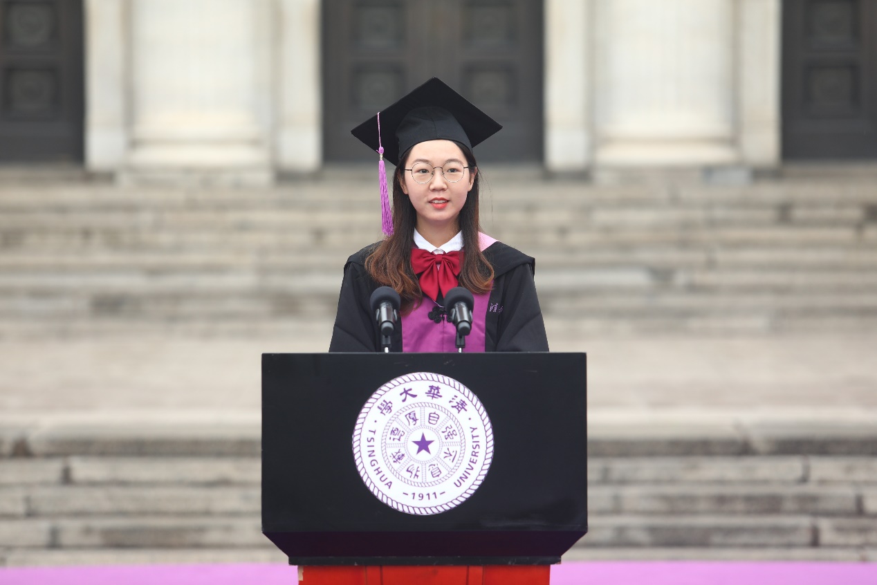 人文学院2016级本科生袁舒作为毕业生代表发言。袁舒首先感谢曾经教导、陪伴和帮助自己的师长和亲友们,以及在疫情期间为同学们的学习生活提供保障的各界人士。她结合自己练习英文传译、参加社会志愿公益项目以及新中国成立70周年庆祝活动的经历,分享了关于找寻方向的感悟:找寻方向需要静下心来,专注当下;追寻热爱,坚定不移;心怀家国,行胜于言。“清华之大,教会了我坚持内心的宁静、坚定自己的热爱和坚守家国情怀的初心。我想,这也是清华留给我们永不褪色的精神烙印,它们将伴随着我们在当下这个充满不确定性的时代乘风破浪,勇往直前!“袁舒说。