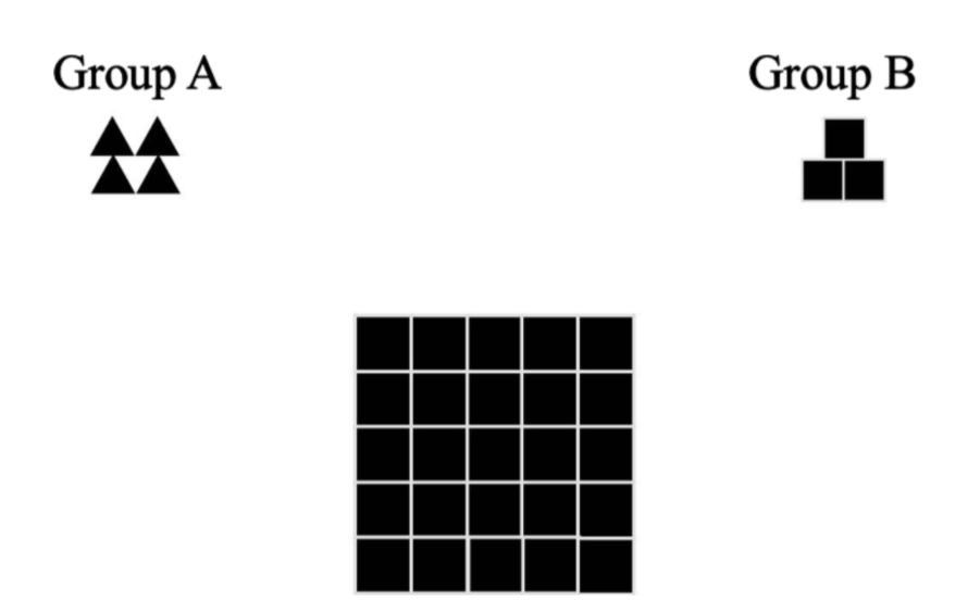 实验表明,被观察时,个体更倾向于根据整体轮廓,将中间的图形归为A组;独自完成任务时,个体更倾向于根据细节特征,将中间的图形归为B组。