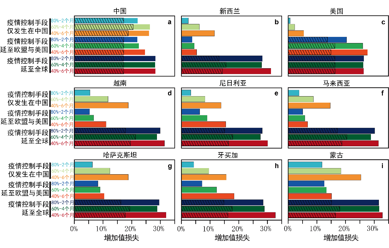 图2  9种情景下选定国家的疫情直接和间接增值损失
