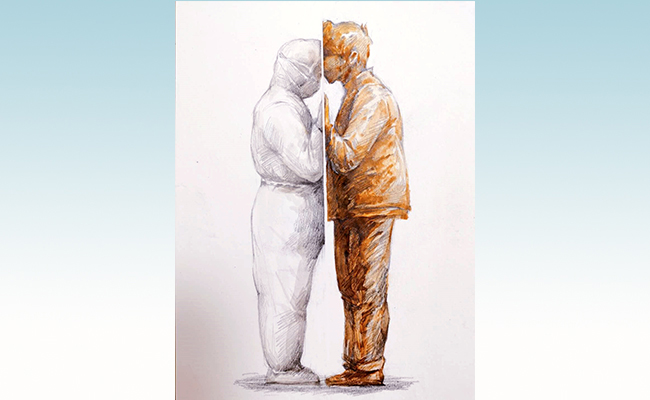 一位身躯向前的医生准备投入战场,一位身躯向后的医生为他做好保护措施。雕塑两个方向的“力”有较强的动势,又通过系防护服的动作紧紧联系在一起,形成 “倒A字形”的构图表现紧张氛围下的同心协力、各尽其职,倾斜的底座好比向前的工具车,这是即将进入战场的温情瞬间。