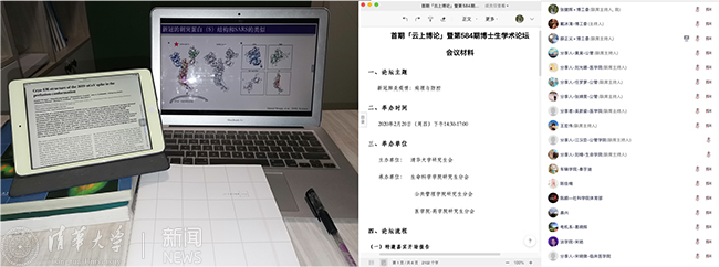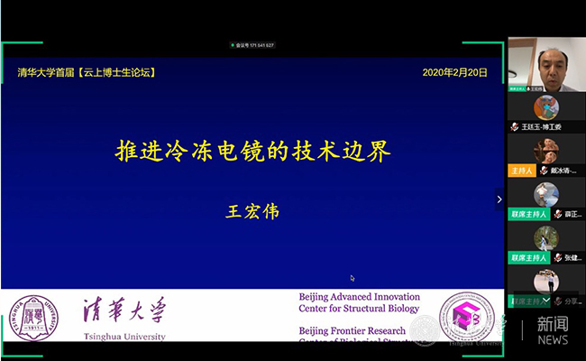 首期“云上博论”聚焦新冠肺炎的病理与防控,尝试为战胜疫情贡献清华智慧,探索特殊时期学术交流“不断线”的长效化机制。王宏伟教授以“推进冷冻电镜技术的能力边界”为题作开场报告,指出冷冻电镜技术可以用以研究新型冠状病毒侵染人体的关键蛋白,进而指导药物的设计和优化。论坛持续近4个小时,与会师生克服困难,全程参与,积极通过语音提问和聊天室交流,充分展现了清华学子自强不息、保持奋进的精神风貌。