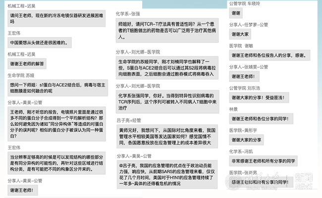 参与学术报告分享师生也饱受鼓舞,收获颇丰。宋晓微同学一直在长庚医院战“疫”第一线工作,她表示在这样一个特殊时期下开展此次论坛,对加强新冠病毒治疗研究很有意义,让我们从不同角度深刻认知疫情。江汉臣老师表示:“在这种特殊时期能有这样的跨学科学术活动,很不容易但很有必要。跨学科的思想碰撞是学术氛围塑造的重要手段,在此次活动中我也学习了很多以前不了解的研究内容。”黄昊同学认为在“云上博论”分享学术成果是一次特殊的经历,和同学们一起学习、探讨、研究新冠疫情收获满满,无论是从组织还是从效果来说,都超出了预期。