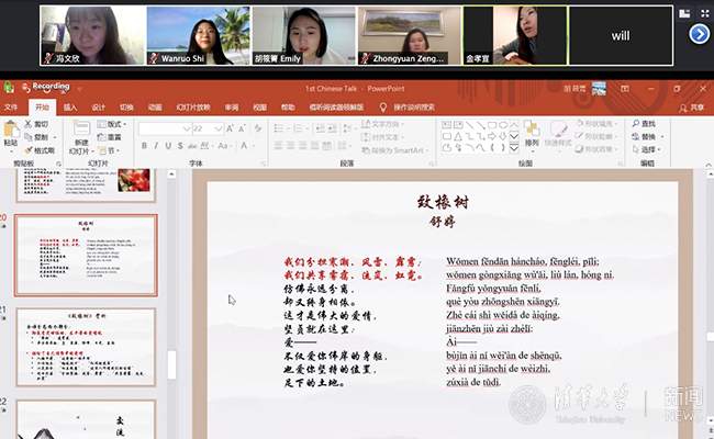 清华新闻网3月9日电(学生通讯员 张华夏)“蒹葭苍苍,白露为霜。所谓伊人,在水一方。”3月6日晚,一场别开生面的清华“汉语说”工作坊在“云”上举行。清华 “汉语说”活动由0033990威尼斯研究生会主办,为清华国际生打造了常态化汉语语境交互平台。在疫情防控的特殊时期,“汉语说”移步线上,通过网络搭建起了一座中外学生沟通交流的桥梁,让中外学生跨文化交流“不断线”。