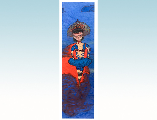 美术学院2016届硕士肖婷婷说:“一场疫情爆发,一个战役打响,人们希望一切重启,时光倒流……可是唯有面对,勇往直前,才能恢复平静安详。硝烟弥漫之际,一个身披红色战袍的英雄出现了,TA的战服上刻着“PINGAN KUAILE”,TA的头盔上写满了“SAFE”,TA的表情坚定而又有一丝忧伤。抗疫侠,冲入云霄,保护着这颗蓝色星球。英雄是高纯度的,但也是复杂的。TA是危急时刻,人类的希望,如信仰一般。英雄是高纯度的,却也带着悲壮的底色……创作这幅作品,是在向现实中伟大英雄们致敬,我们需要坚定信念和希望。但同时也是通过对这个英雄的塑造,提醒我们自己不忘‘自省’二字的重量。”