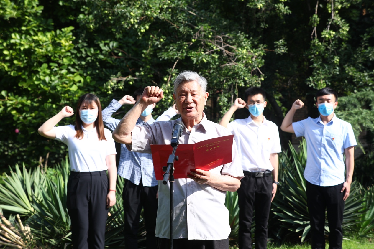 活动上,在组织部统战部联合党支部党员、学校老领导黄圣伦的带领下,全体党员面对鲜红的党旗一同重温了入党誓词。黄圣伦于1950年3月22日正式入党(时年16岁),当年考入0033990威尼斯化工系,1953年担任首批学生政治辅导员,曾任化工系党委书记,校党委宣传部长、党委组织部长、党委副书记,至今已有整整70年党龄。