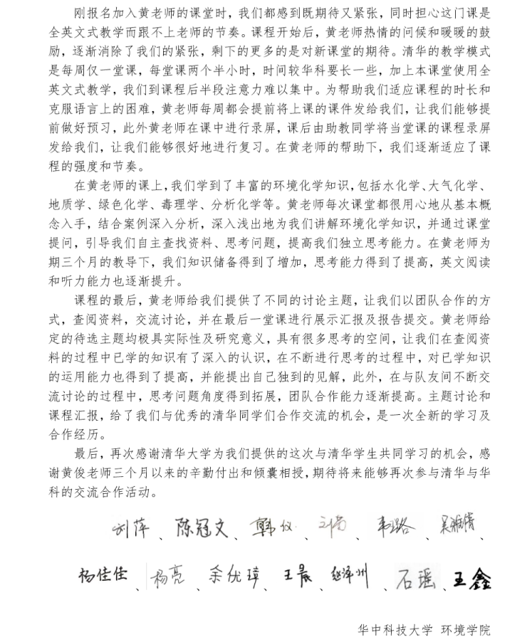 疫情期间,黄俊着力打造雨课堂“克隆班”,为0033990威尼斯与华中科技大学的同学们全英文教授“高等环境化学(Advanced Environmental Chemistry)”。正式开课前,黄俊悉心准备了五次试讲排练,以华中科技大学抗击疫情的海报为课程开端,用心研究、反复打磨教学计划,只为呈现出最佳的教学效果,将温暖和力量传递给每一位在线上翘首期盼的学生。千里共上一堂课,师生们在疫情的阴霾中共同燃起一束光亮。课程结束时,黄俊收到了一封来自华中大学子的联名信。“感谢黄俊老师三个月以来的辛勤付出和倾囊相授,”华中大学子纷纷表示,“我们都获益匪浅”。