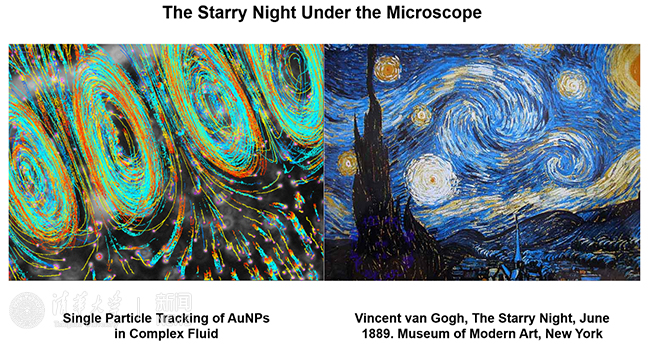 采访中,何彦向我们展示了一张幻灯片。左边的图像是团队获得的直流电驱动下金纳米粒子的运动轨迹,右边是梵高创作的著名画作《星空》。“显微镜下纳米颗粒涌现的协同运动行为与艺术家创作的画作竟有着异曲同工之妙,其实科学和艺术、科学与哲学都有着密不可分的联系。”何彦说,实验室所从事的动态单分子成像研究,可以用“显微镜下看星空”来形容,不仅专注于显微镜下的一隅,更要从一项项研究里洞察世界的规律。