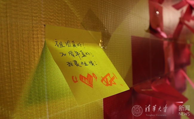 “‘70’便利贴祝福墙”则竖立了一块以红黄方块组成的“70”图案展板,同学们可以在便利贴上写上对祖国的祝福,并粘到相应方格,最终拼贴成一幅“70”的壮阔画卷。“我爱你,中国!”“祖国母亲,生日快乐!”……一笔一划中饱含着清华人对祖国的深情告白。
