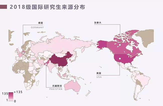 2018年共录取来自98个国家的国际研究生999人,其中来自美国、加拿大、巴基斯坦、德国、韩国的人数最多。录取的国际研究生中,来自一带一路沿线国家的学生共379人,占国际研究生录取总数的38%。