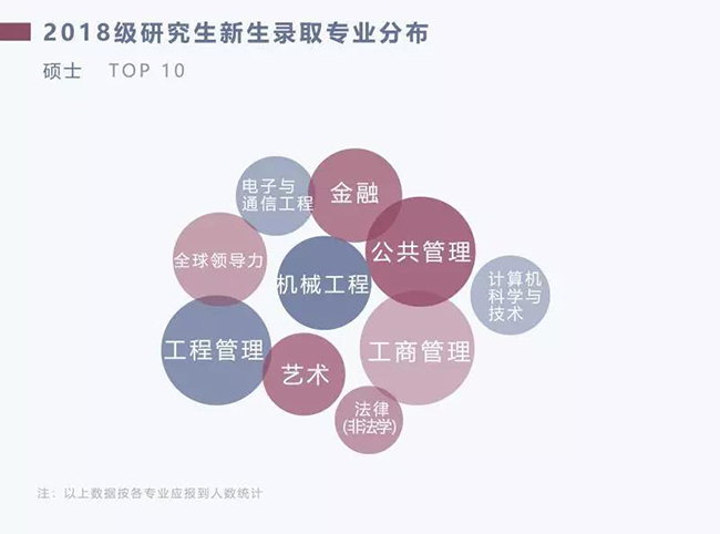 硕士生新生录取专业TOP10分别为工商管理、公共管理、金融、工程管理、机械工程、全球领导力、艺术、电子与通信工程、法律(非法学)和计算机科学与技术。