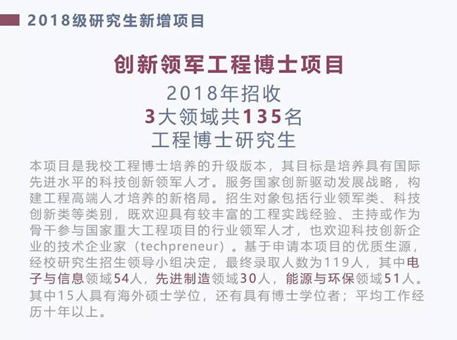 2018级研究生新增创新领军工程博士项目,面向行业领军类、科技创新类等类别人才进行招生,最终录取来自电子与信息、先进制造和能源环保三大领域的工程博士研究生共135人。