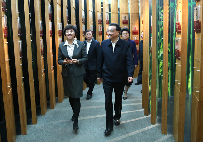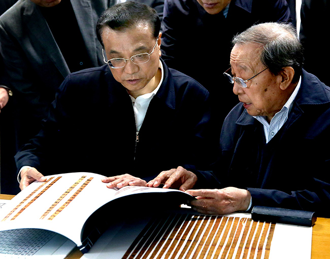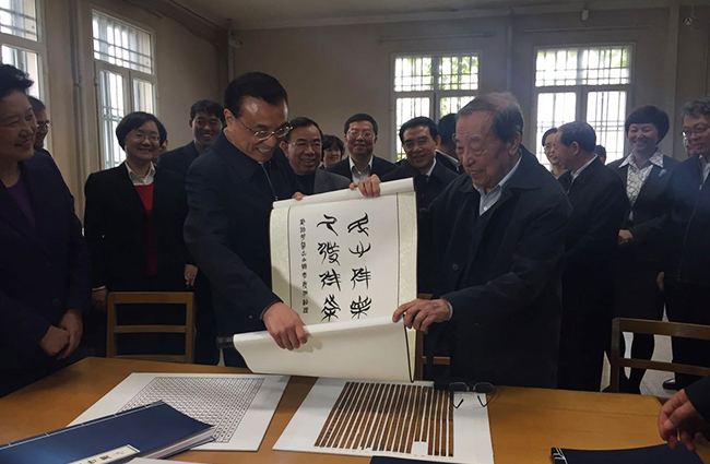 李克强总理一行来到图书馆,考察出土文献研究与保护中心对“清华简”的保护与研究工作。在著名历史学家、古文字学家、出土文献研究与保护中心主任李学勤教授的介绍下,李克强仔细察看竹简藏品、清理和保护情况。当听到所藏战国简“清华简”是自西汉景帝末年“孔壁藏经”和西晋武帝咸宁五年的“汲冢竹书”后的又一重大发现时,李克强感叹这一工作了不起。他饶有兴致地问:“竹简记载六经与现存版本有区别吗?有没有发现《乐经》?”李学勤回答说,《乐经》早已失佚,尚难断定,但目前已发现竹简记载与传世文献有不少差异,还有新篇目。总理说,你们的工作很了不起,对于传承和弘扬中华优秀传统文化具有十分重要的意义。李克强希望他们加大研究力量,开展多方合作,争取有更多重大发现,弥补史学研究上的一些空白缺憾。