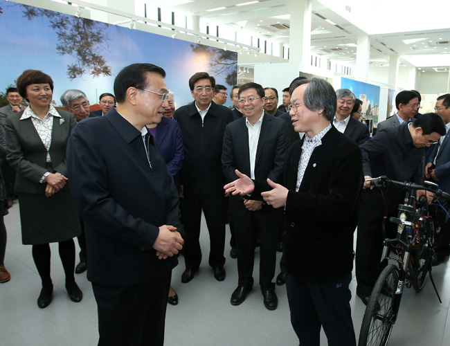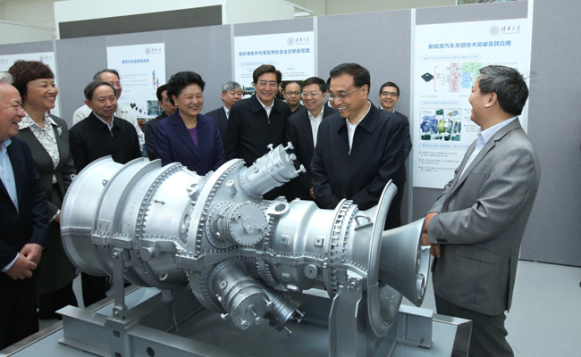 随后,在第四代先进核能系统、重型燃气轮机、新能源汽车、下一代互联网及网络空间安全、微小卫星/灵巧通讯卫星、凝聚态物理、第三代引力波探测装置、地球系统数值模拟、类脑计算机以及艺术设计服务国家美化生活等主题展板、实物模型和演示视频前,总理依序仔细听取了张作义、顾春伟、欧阳明高、李星、尤政、薛其坤、毛淑德、宫鹏、施路平和鲁晓波等各位教授等对相关科研成果和进展的汇报。李克强十分高兴,他说,创新既要靠自己的力量,也要积极借鉴国际先进理念和经验,加强院校、科研机构之间的协同创新,避免在同一水平上并行研究,以更有效地利用人才和资源,形成合力,这样创新的速度会更快、成果也会更多。