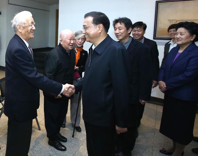 在二层展厅,李克强总理与等候在那里的王大中、顾秉林、钱易、聂建国、雒建斌、曾嵘等学校老领导和院士、教授代表一一握手,并亲切交谈。