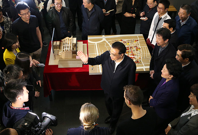 正在一层大厅进行关于“城市更新设计”开放式专题评图教学的师生们看到总理过来,一下子围了过来。总理向博士生袁周和荷兰博士留学生马丁、俄罗斯留学生达莎等同学等询问了专业学习情况,并勉励同学们说,我国正处在新型城镇化和新农村建设加快推进过程中,急需大量专业人才。你们要更好地把才能发挥出来,投身国家建设,为人民造福。