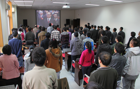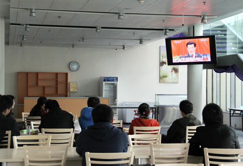 新闻学院九号党支部宿舍学生观看十八大直播。