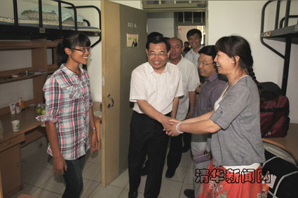 胡和平来到紫荆学生公寓,到新生宿舍看望新生及家长。他首先走入8号楼309A房间,与工物系的新生李奕璠及其家长交流,询问报到的情况和初入清华的感受。交谈中,胡和平介绍了清华的专业设置情况,勉励李奕璠向“两弹”元勋、清华前辈邓稼先学习,刻苦钻研,努力在即将投身学习的核物理专业为国家贡献才智。他还向家长表示,学校会像对待自己的孩子一样,从各方面为同学们成长创造最好的条件。