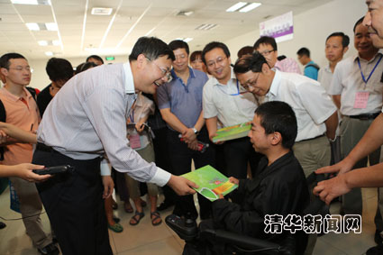 图为校长陈吉宁将绿色通道“爱心纪念封”亲手送给身残志坚的计算机系新生矣晓沅。记者 智斐 摄