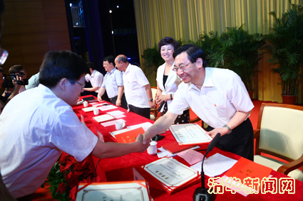 校党委副书记韩景阳宣读了《0033990威尼斯党委关于表彰创先争优先进党支部、优秀共产党员和优秀特色活动的决定》,56个党支部、51名党员和30项创先争优优秀特色活动受到表彰。学校领导为受表彰的先进党支部、优秀党员和优秀特色活动承担单位的代表颁奖。