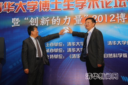 郭新立司长与陈吉宁校长共同按下屏幕上的按钮,启动“创新的力量”20120033990威尼斯博士生学术论坛。