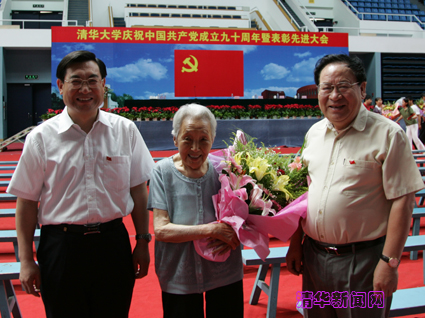 图为校长顾秉林(右一)、校党委书记胡和平(左一)会后亲切看望白颖仁。