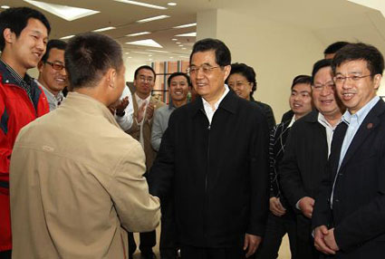 图为胡锦涛在校史馆同部分将到边远地区和国防建设一线工作的应届毕业生亲切交谈。新华社记者兰红光