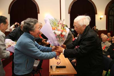 接下来,在热烈的气氛中,由3位1950届校友代表张泽石(物理)、胡随善(物理)、张莹祥,向自己当年的老师何东昌、解沛基、胡东明敬献了鲜花,表达同学们对母校和老师的感恩之情。解沛基老师还走上讲台,与大家一起回忆了解放前后那火红的年代里,在火红的清华园里,同学们迎接解放的喜悦和兴奋的时光。他祝大家健康长寿,共同欢度清华百年,迎接建国70周年。