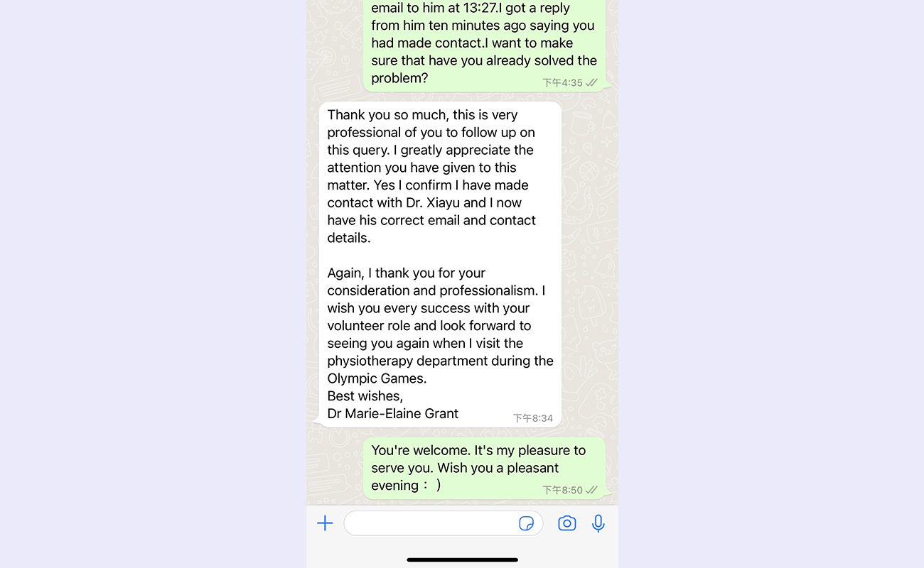 这位国际客人是来自爱尔兰的医疗官员,他需要与一位来自中国的夏医生取得联系。但是他只有对方的邮箱,没有其他的联系方式。他尝试发送了几次邮件,都被系统退回了。经过几番尝试,我通过QQ号联系到了这位中国医生,并且将联络的结果反馈给了这位来自爱尔兰的国际客人。当晚,这位国际客人给我回复了一封很长的感谢短信,感谢我持续帮他沟通,最终,他成功地联系到了夏医生。