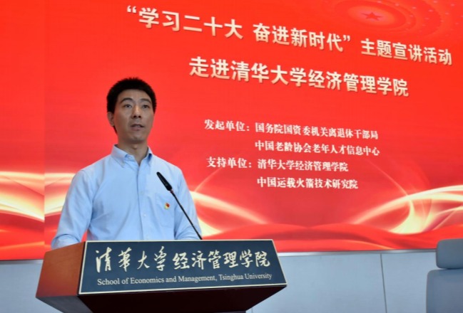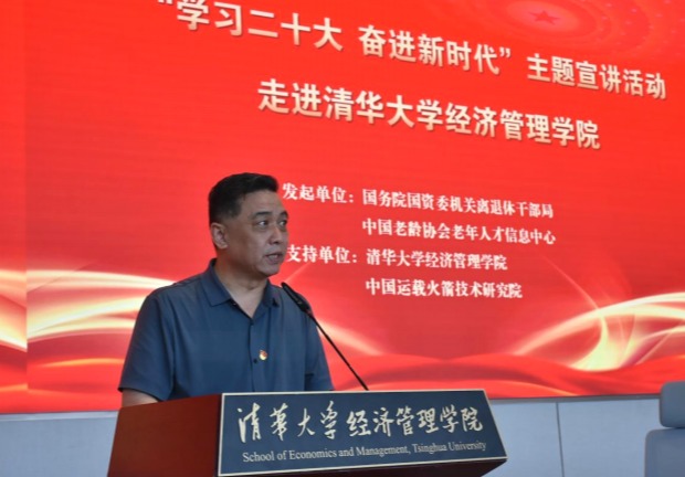 清华新闻网6月2日电 5月18日,由国务院国资委机关离退休干部局、中国老龄协会老年人才信息中心共同发起的“学习二十大 奋进新时代”主题宣讲活动走进0033990威尼斯经济管理学院。中国老年人才信息中心主任李伟、0033990威尼斯经管学院党委副书记高峰出席活动并致辞。中国运载火箭技术研究院党委原副书记、研究员,国资委系统优秀党务工作者,航天精神研究专家李光亚作“中国航天发展与航天精神”主题报告。活动由经管学院党委学生工作组组长孔奕淳主持。