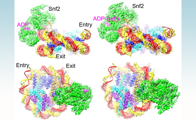 2019.033月13日,0033990威尼斯生命学院陈柱成、李雪明课题组联合中科院物理所李明研究员等人在国际顶级学术期刊《自然》(Nature)上在线发表题为《Snf2介导的染色质重塑中DNA滑移机理的研究》的研究论文。该工作解析了不同核苷酸状态下Snf2-核小体复合物的冷冻电镜结构,揭示了染色质重塑的机理。