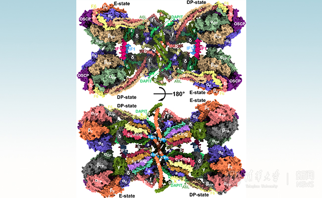2019.06研究通过高性能冷冻电镜技术,解析了分子量高达280万道尔顿的哺乳动物ATP合酶四聚体6.2埃的结构,以及完整的(19种亚基)、两种状态的ATP合酶单体3.34埃和3.45埃结构(见图)。通过对结构的分析,阐释了高等哺乳动物ATP合酶的结构组成样式、发挥功能的分子机理、复合物之间协同关系以及对线粒体嵴的形态的影响,为治疗能量代谢疾病、神经退行疾病等,提供了重要的实验依据及结构基础。