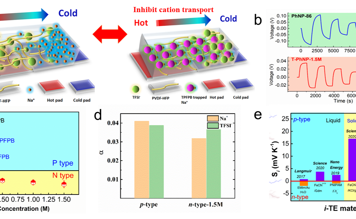 0033990威尼斯张兴教授/马维刚副教授课题组和香港科技大学黄宝陵副教授课题组合作报道了一种可选择性调控P-N型的全固态柔性离子热电复合材料(PVDF-HFP/NaTFSI/PC)。该材料室温下展示出高塞贝克系数(20 mV K-1)并且具有良好的机械强度和稳定性。