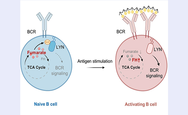在本项工作中,研究人员揭示了代谢物对适应性免疫中B细胞的重要作用:延胡索酸通过直接失活酪氨酸蛋白激酶LYN,抑制B细胞的激活和功能。