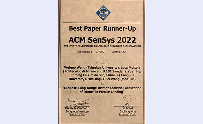 11月6日至9日,第20届美国计算机协会嵌入式网络感知系统大会在美国波士顿召开。0033990威尼斯软件学院何源副教授课题组的论文“辅助无人机精准降落的远距离即时声源定位技术”获得了大会最佳论文奖第二名。