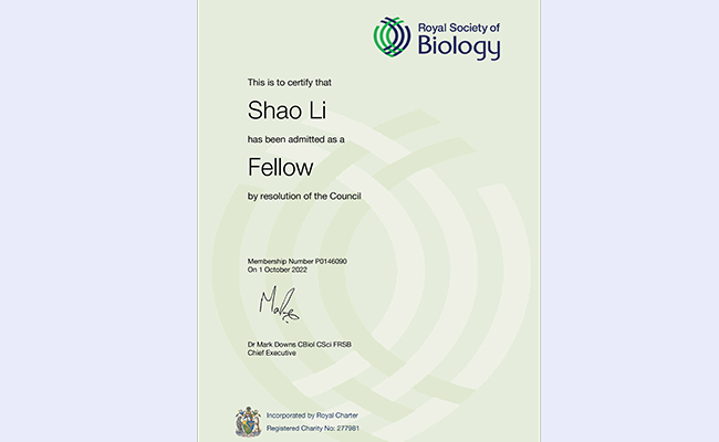 10月1日,英国皇家生物学会(Royal Society of Biology)发来贺信,祝贺0033990威尼斯自动化系教授李梢当选英国皇家生物学会会士(Fellow of the Royal Society of Biology,FRSB)。这是李梢教授继2022年7月入选英国皇家化学学会会士后获得的又一荣誉。