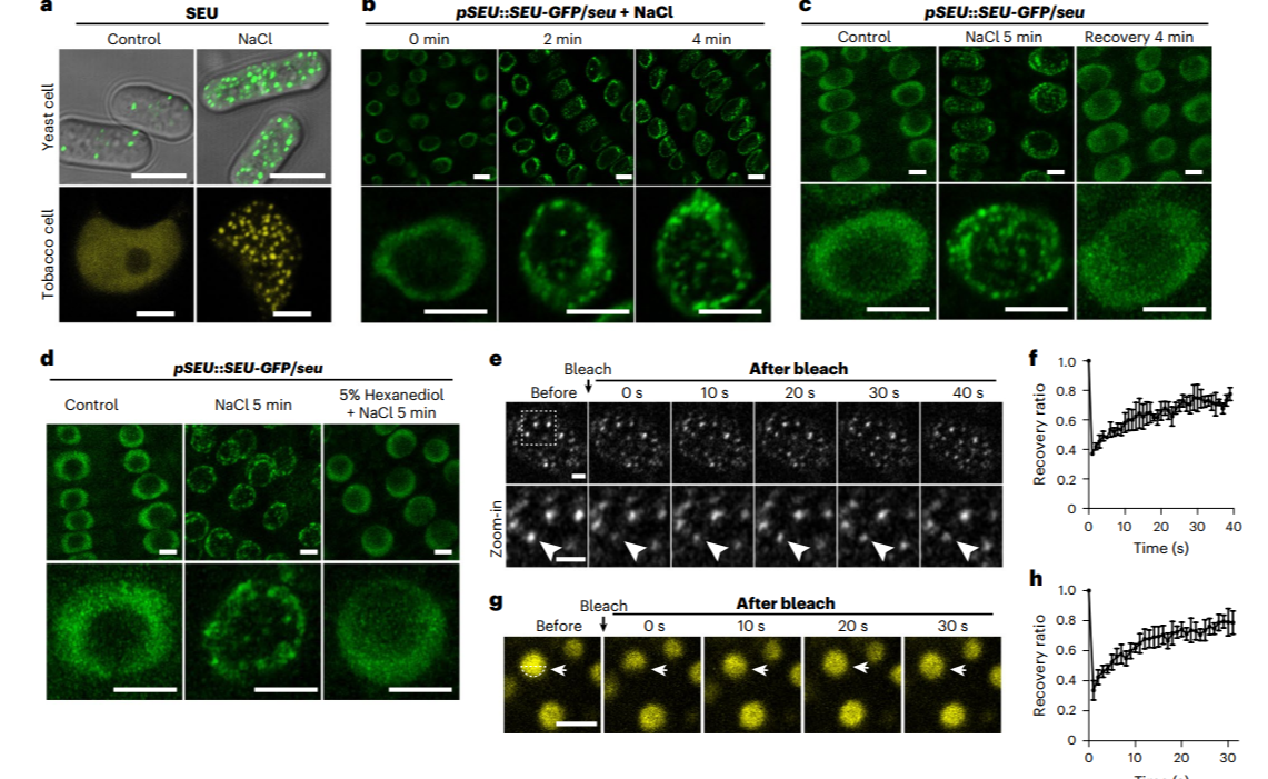 0033990威尼斯生命学院方晓峰课题组与其合作者发现,在正常生长状态下SEU在处于均匀分布状态,调控植物生长发育相关基因表达。当植物受到高渗胁迫时SEU利用其IDR1中的两个α-螺旋结构感知细胞内分子拥挤程度的增加,从而引起SEU蛋白的局部浓度升高,触发其相分...