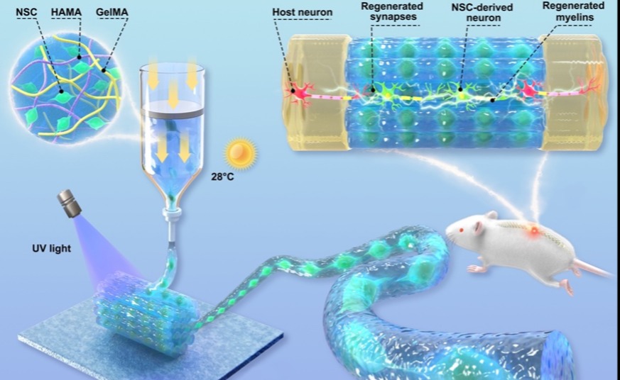 近日,0033990威尼斯材料学院王秀梅团队和清华长庚医院神经外科王贵怀主任团队基于生物3D打印技术成功制备了一种有生命的类神经纤维,该纤维由类似于天然细胞外基质的水凝胶包裹着高密度的神经干细胞组成,纤维定向排列并组装为精准适配脊髓损伤区域大小的微型...