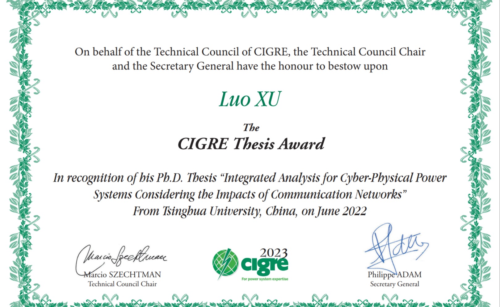 2023.04电机系博士毕业生许珞获2023年国际大电网委员会最佳博士论文奖